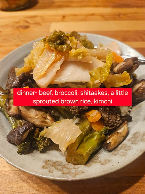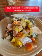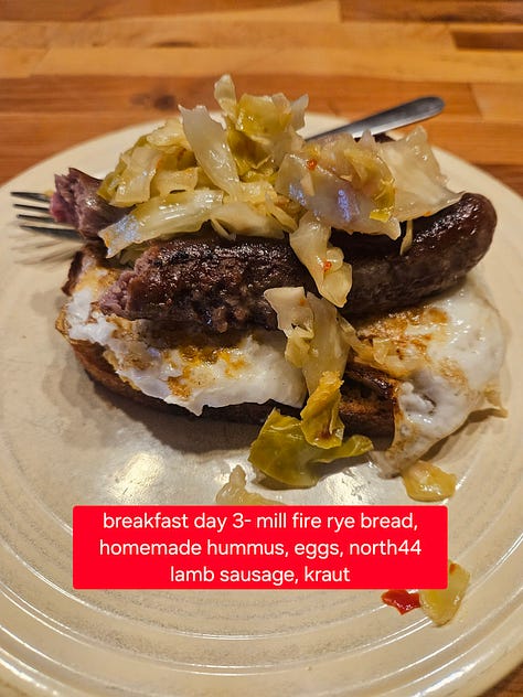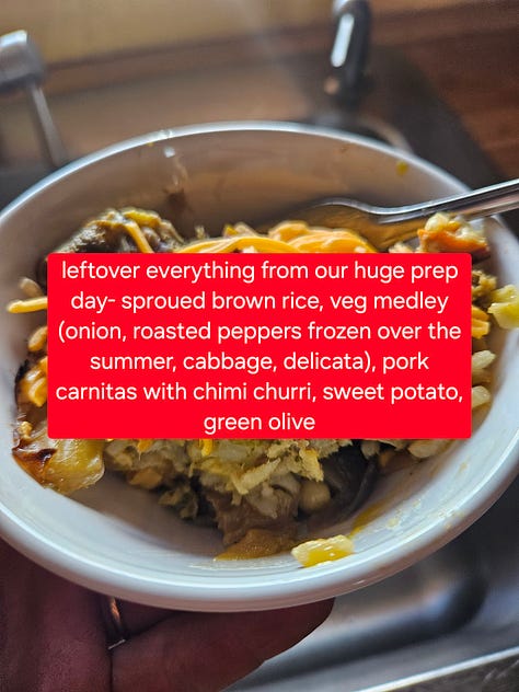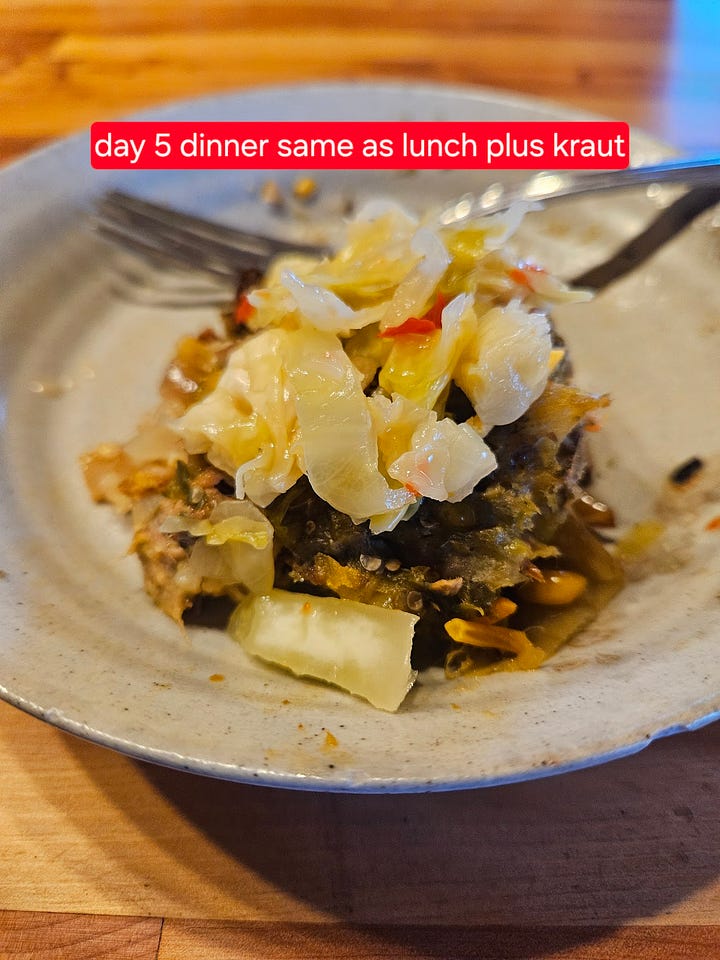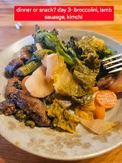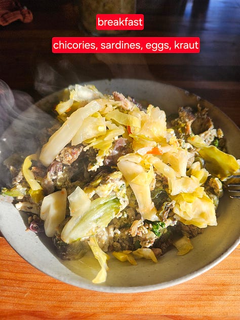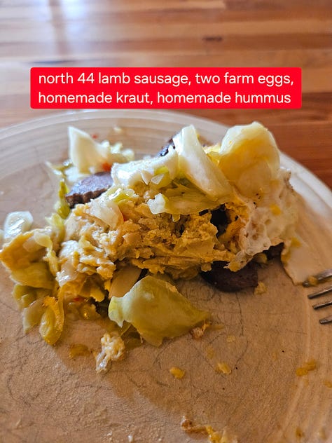 There are a couple of themes developing here- eating lots of leftovers! This is key for me to make sure I have nourishing food, good protein sources, and can keep eating locally. The second theme is fermented foods! I’m not sure if you’ve noticed, but I am a fiend for sauerkraut and kimchi and put it on almost everything I eat. David and I make huge batches throughout the season; it is absolutely a staple in our diet.