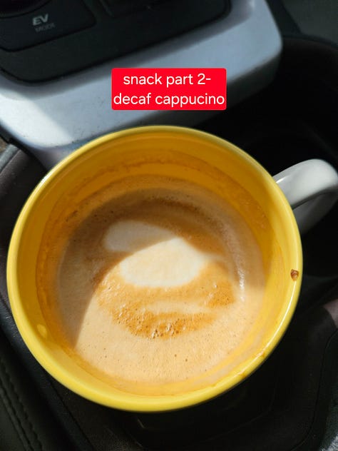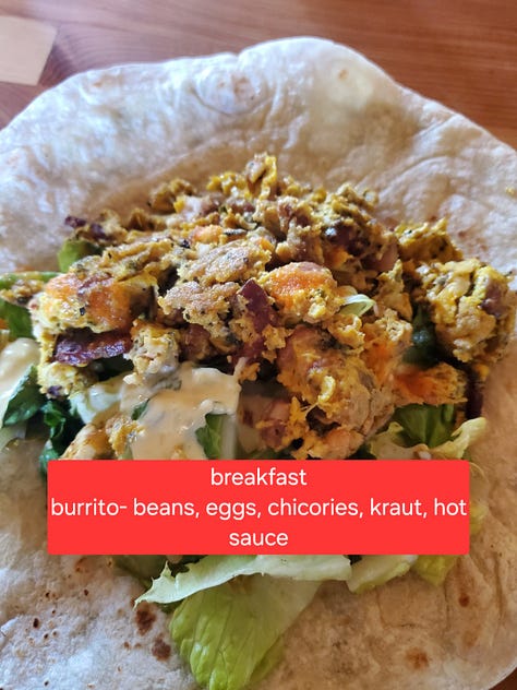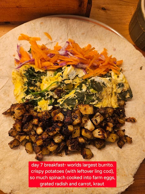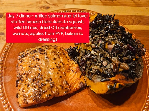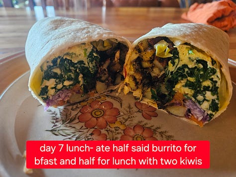 Day 7 (is actually Day 8. As I forgot to take most photos on Day 7 and we went to dinner at a friend’s house that evening). I made the world’s largest breakfast burrito, so it satisfied two meals for me. Dinner was leftover stuffed squash that we had taken to our friends for dinner the night before.