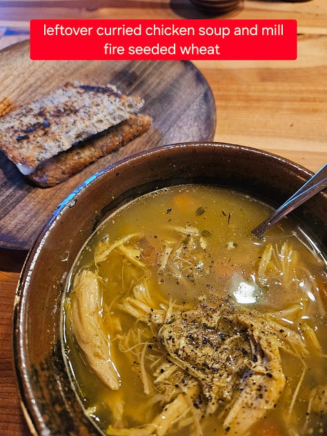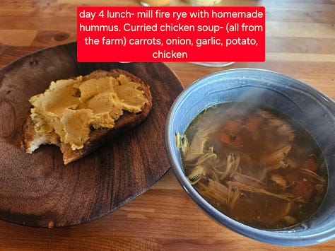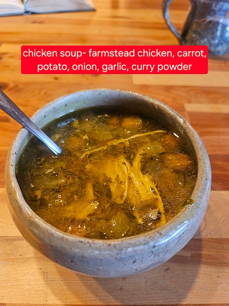 Day 1- On this morning, I finished making an enormous pot of chicken soup. I stuck a whole chicken in the instant pot for about 2 hours pressure cooked, pulled it from the broth, stripped the bones out, put the meat back in the broth, and added vegetables and curry powder. You’ll notice that we eat this over and over again this week.