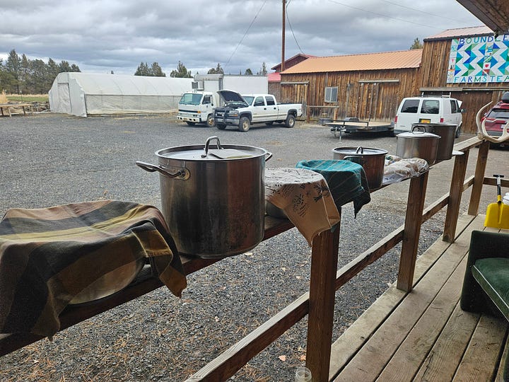 This video shows all of our food prep- the majority of ingredients grown right here on the farm or in Central Oregon. The vats of food in order- Veggie Medley for burritos (all veg from Boundless- storage cabbage, frozen corn, frozen roasted peppers, delicata, onion), Organic White Rice (Lundberg Farms, CA), empanada dough using Rainshadow Organics flour and eggs from our hens, Organic Sprouted Brown Rice (Lundberg Farm, CA), Masa (OG Bob’s Redmill) with Lard (rendered from Steady Home Farm pig fat) and with Avocado Oil (for our vegetarian friend), Carnitas empanada filling (Carnitas from Steady Home Farm pork shoulders, homemade and frozen chimichurri, red onion, and OG sweet potatoes (purchased from store), and Veg Tamale Filling (all grown on farm- beans, squash, peppers, onion, and spinach).